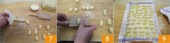 Coupez les boudins en morceaux 7 et, en exerçant une légère pression avec le pouce, faites-les glisser sur la planche à gnocchis pour obtenir la forme classique 8. Si vous n'avez pas de planche à gnocchis, vous pouvez utiliser une fourchette et les faire glisser sur les dents; dans ce cas également, utilisez de la semoule pour éviter qu'ils ne collent. Au fur et à mesure que vous préparez les gnocchis de pommes de terre, disposez-les sur un petit plateau avec un torchon légèrement fariné, bien espacés les uns des autres 9. Si vous avez l'intention de les cuire, vous pourrez en verser quelques-uns à la fois dans de l'eau bouillante et salée; dès qu'ils remontent à la surface, les gnocchis sont cuits et prêts à être égouttés et assaisonnés.