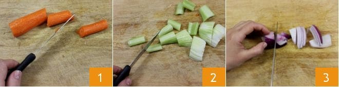 Pour préparer le rôti farci aux figues et jambon cru, commencez par les légumes qui serviront à cuire le rôti. Nettoyez et épluchez les carottes, puis coupez-les en deux 1. Lavez les branches de céleri et coupez-les en morceaux assez grands 2. Ensuite, épluchez l'oignon rouge et coupez-le également en morceaux assez grands 3. Mettez les légumes de côté.