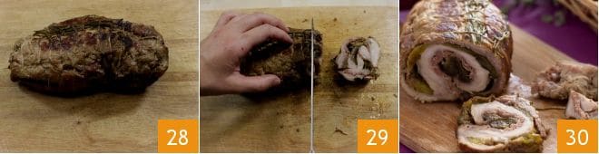 Une fois refroidi 28, prenez le rôti et placez-le sur une planche à découper, coupez-le en tranches d'environ 2-3 cm d'épaisseur 29. Votre rôti farci aux figues et jambon cru sera alors prêt à être servi chaud ou tiède 30 accompagné de la sauce aux légumes !