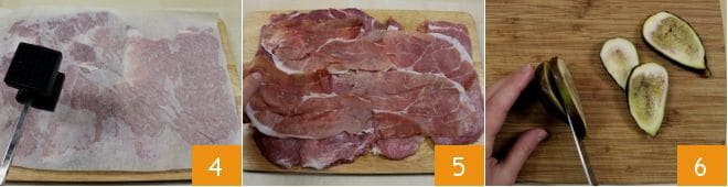 Prenez ensuite la viande, placez-la sur une planche à découper, recouvrez-la d'une feuille de papier sulfurisé 4 et aplatissez-la avec un maillet pour la rendre fine et tendre. Ensuite, retirez la feuille de papier sulfurisé et disposez les tranches de jambon cru sur la viande 5. Lavez ensuite les figues et, avec toute la peau, coupez-les en tranches d'environ un demi-centimètre d'épaisseur 6.