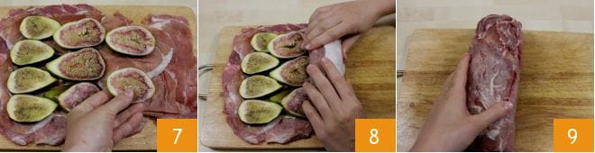 Disposez également les tranches de figues 7 en formant une couche au-dessus du jambon, en laissant environ 1 cm du bord, puis commencez à bien rouler le rôti 8, délicatement pour ne pas faire sortir la farce, jusqu'à le fermer complètement 9.