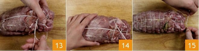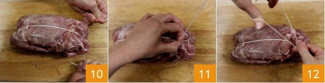 Maintenant, procédez à ficeler le rôti avec la ficelle de cuisine. Pour cette opération, vous pouvez consulter l'école de cuisine : Comment ficeler le rôti. Passez la ficelle d'abord sous puis au-dessus de la viande 10, dans le sens de la longueur, en fixant bien les extrémités du fil 11 et en laissant une partie de la ficelle légèrement plus longue. Pour former la cage, prenez la ficelle et créez une boucle en tenant la base de celle-ci avec vos doigts, insérez la main dans la boucle 12.