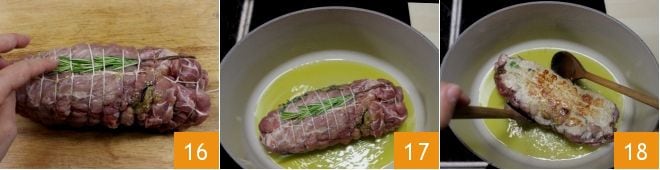 Placez dans la cage une branche de marjolaine, une de thym et une de romarin 16. Ensuite, prenez une grande casserole, versez-y de l'huile d'olive en abondance jusqu'à recouvrir le fond, ajoutez le rôti 17, tournez-le également de l'autre côté pour le faire dorer 18 (pour le tourner, utilisez 2 cuillères en bois).