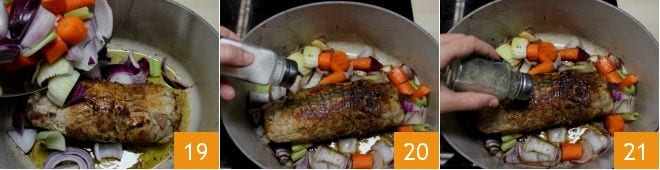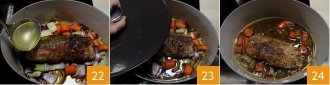 Versez le bouillon de légumes 22 (voir ici la fiche du bouillon de légumes) et faites cuire avec le couvercle 23 à feu doux pendant une heure et demie, en retournant le rôti de temps en temps. Une fois le temps nécessaire écoulé, découvrez et éteignez le feu 24.