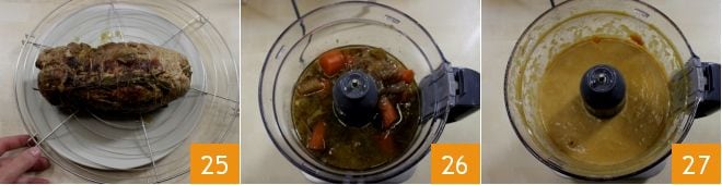 Placez le rôti sur une grille et laissez-le tiédir 25; versez le fond de cuisson dans le mixeur pour le mixer 26 et obtenir une sauce épaisse 27 que vous utiliserez en accompagnement.