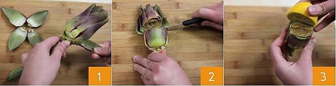 La première chose à faire pour préparer les artichauts frits à la moutarde est de nettoyer les artichauts : retirez les feuilles extérieures les plus dures 1, et coupez la partie supérieure des artichauts 2 ainsi que la tige, en la coupant juste en dessous de la base de l'artichaut (pour voir comment faire, cliquez ici) en ne gardant que le cœur, pour éviter que les artichauts ne noircissent pendant la préparation, arrosez-les avec la moitié d'un citron 3