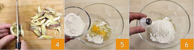 Après avoir nettoyé les artichauts, passez à la préparation de la pâte : dans un grand bol, mettez les œufs, ajoutez la farine 5, le sel 6,