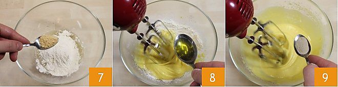 et la moutarde, et à l'aide d'un batteur ou d'un mixeur, réalisez une pâte 7 en ajoutant durant la préparation également la cuillère à soupe d'huile 8 et la cuillère à café de levure 9; si la pâte s'avère trop épaisse, ajoutez-y 1 ou 2 cuillères à soupe d'eau tiède (inversement, ajoutez un peu de farine).
