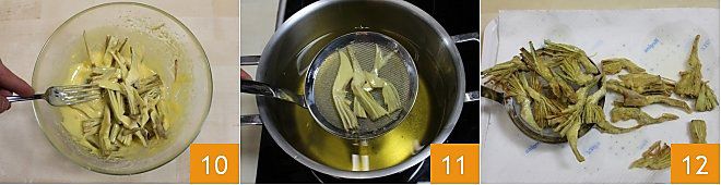 Versez les artichauts, égouttés et séchés, dans la pâte et laissez-les bien s'imprégner pendant quelques minutes 10. Pendant ce temps, chauffez l'huile de graines (ou si vous préférez, d'olive), dans laquelle vous plongerez un à un les différents quartiers d'artichaut, en veillant à ce qu'ils ne collent pas les uns aux autres 11; retournez-les sur eux-mêmes plusieurs fois, afin de les faire dorer sur toute la surface. Selon la taille de l'artichaut, en 5/7 minutes ils seront prêts, retirez-les donc de l'huile et placez-les à égoutter sur du papier absorbant 12; servez-les encore chauds, éventuellement en les saupoudrant d'une pincée de sel.