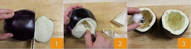 Pour préparer les aubergines farcies de spaghetti à la norma, commencez par laver les aubergines, éliminez le pédoncule avec les feuilles et coupez la partie supérieure des aubergines 1. Creusez-les délicatement avec un petit couteau d'office et mettez de côté la chair 2, que vous arroserez avec un peu de citron ou de vinaigre pour ne pas qu'elle noircisse avant de l'utiliser. Égalisez également le fond des aubergines pour qu'elles tiennent debout et salez-les 3.