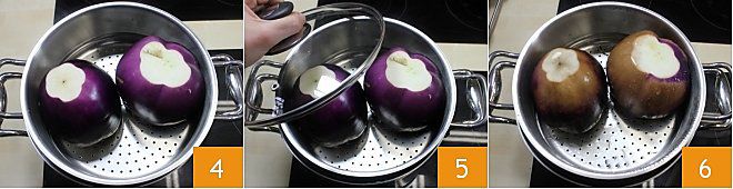 Placez les aubergines sur le panier d'un cuiseur vapeur 4. Si vous ne disposez pas d'un cuiseur vapeur, vous pouvez utiliser une passoire en acier. Sinon, cuisez les aubergines en papillote avec du papier aluminium, dans un four statique à 180° pendant 15-20 minutes, en vérifiant qu'elles ne se désagrègent pas. Couvrez la vapeur avec le couvercle 5 et cuisez-les pendant environ 20 minutes ou jusqu'à ce qu'elles soient tendres 6,