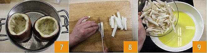 en les retournant délicatement quelques fois 7. Coupez maintenant la chair de l'aubergine en morceaux 8 et faites-la cuire dans beaucoup d'huile d'olive pendant 10-15 minutes 9, jusqu'à ce qu'elle soit toute tendre et dorée.