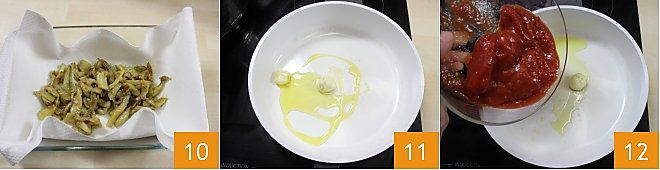 Égouttez les aubergines frites sur une feuille de papier absorbant 10 et mettez-les de côté. Dans une autre poêle, faites dorer les gousses d'ail entières avec un filet d'huile 11 ajoutez les tomates pelées 12 et faites cuire jusqu'à ce qu'elles se réduisent en une pulpe.