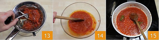 Ensuite, placez la pulpe dans le moulin à légumes 13 pour obtenir une sauce lisse 14. Remettez la sauce obtenue sur le feu 15. Sinon, vous pouvez utiliser de la purée de tomates et une cuillère de triple concentré de tomate dilué dans de l'eau chaude.