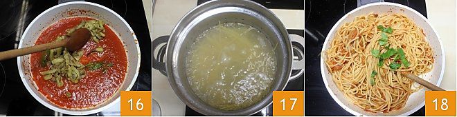 ajoutez les feuilles de basilic et les aubergines 16 que vous avez précédemment cuites et mises de côté. Cuisez maintenant les spaghetti dans beaucoup d'eau salée 17, une fois cuits égouttez-les et faites-les sauter dans la poêle avec la sauce 18,