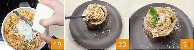 assaisonnez enfin avec la ricotta salée râpée 19. Farcissez les aubergines avec les spaghetti 20. Râpez un peu de ricotta salée aussi sur les aubergines et garnissez avec une feuille de basilic 21. Vos aubergines farcies de spaghetti à la norma sont prêtes à être servies !