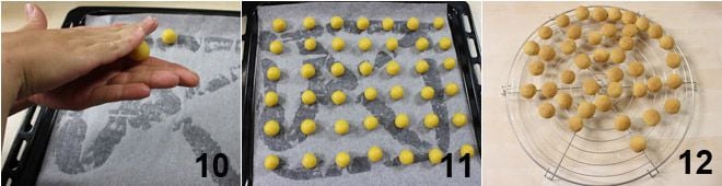 Après le temps nécessaire, chemisez une plaque de cuisson avec une feuille de papier sulfurisé et commencez à former des petites boules, pas très grandes, légèrement aplaties d'un côté, avec la pâte 10, puis disposez-les sur la plaque (laissez-les reposer à nouveau au réfrigérateur si la pâte est trop molle) et enfournez-les à 180° pendant 20 minutes 11. Une fois cuites, laissez-les refroidir sur une grille 12