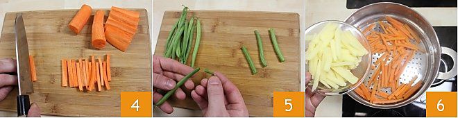 Entre-temps, préparez les légumes qui accompagneront le loup de mer: épluchez 2 carottes, la courgette et les pommes de terre et coupez le tout en bâtonnets 4, pour plus de détails sur la découpe des légumes, cliquez ici (Comment couper les légumes). Éliminez les extrémités des haricots verts 5 et placez les légumes dans le cuiseur vapeur: d'abord les carottes et les pommes de terre 6, faites cuire pendant quelques minutes et