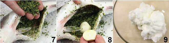 Utilisez une partie du hachis fraîchement préparé pour remplir le ventre du poisson 7 et ajoutez 2 gousses d'ail sans la peau 8. Passez maintenant à la croûte de sel : montez les blancs en neige ferme et transférez-les dans un bol 9.
