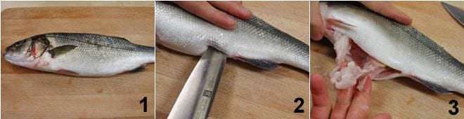 Pour préparer le bar en croûte de sel aux herbes et bière, commencez par éviscérer le bar 1 en pointant le couteau dans le trou situé près de la queue 2 et en découpant jusqu'à la tête. Videz son ventre 3 puis rincez le bar sous l'eau courante.