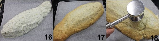 Étalez une feuille de papier cuisson sur une plaque (ou un plat) puis déposez une fine couche (environ 1,5 cm) du mélange obtenu, qui formera le lit de cuisson pour le bar 13. Placez ensuite le bar sur le lit de sel 14 et recouvrez-le avec le mélange de sel en le pressant délicatement pour bien faire adhérer la pâte 15.