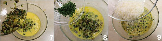 Prenez une poêle antiadhésive, chauffez 2/3 cuillères à soupe d'huile 4 et faites revenir les courgettes et l'aubergine coupées en dés pendant environ 10 minutes 5. Une fois cuites, laissez-les refroidir. Dans un bol, mettez les œufs battus et ajoutez la ricotta 6.