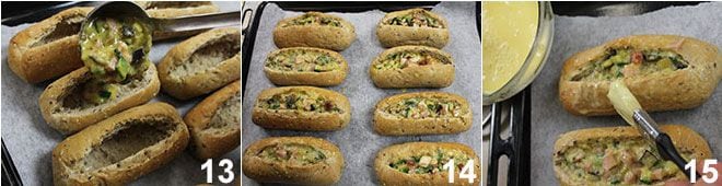 À l'aide d'une louche, remplissez les petits pains jusqu'au bord (veillez à prendre une louche de garniture bien équilibrée en légumes et liquide : ne prenez pas trop de liquide sinon le pain sera trop imbibé) (13-14). Dans un bol, battez l'œuf et, à l'aide d'un pinceau, badigeonnez les petits pains avec ce mélange 15. Placez maintenant les bateaux de pain farcis dans un four ventilé préchauffé à 180° et faites cuire pendant 25 minutes, afin que la garniture du pain soit compacte et bien dorée sur la surface. Sortez-les du four et servez vos bateaux de pain farcis tièdes ou froids, entiers ou coupés en tranches.