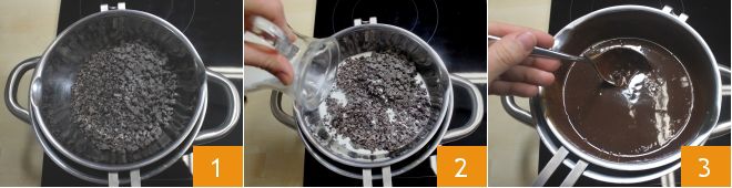 Pour préparer la bavareisa, faites fondre le chocolat noir (en pastilles ou haché) au bain-marie 1 et mélangez-le avec le lait et la crème 2. Faites bien fondre pour obtenir un chocolat sans grumeaux et d'une consistance crémeuse 3. Une fois prêt, gardez-le au chaud.