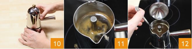 Fermez bien la cafetière 10, pour que le café ne s'échappe pas sur les côtés pendant qu'il monte, et placez-la sur une flamme basse et constante pour obtenir un café corsé. Au fur et à mesure que le café monte, une mousse dense se formera 11 : nous vous conseillons de ne pas laisser le café bouillonner trop longtemps pour préserver sa douceur et son arôme. Votre café est prêt : avant de l'utiliser, mélangez-le directement dans la moka avec une cuillère pour rendre le café plus homogène 12.