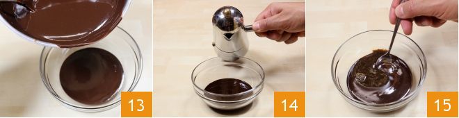 Lorsque le café est prêt, pour chaque tasse, versez dans un bol 80 gr de chocolat encore chaud 13 et ajoutez 50 gr de café 14, environ une petite tasse, et mélangez pour bien amalgamer les ingrédients 15.