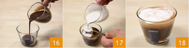 Versez dans un verre moyen le mélange bien chaud 16 et complétez avec la garniture de crème, qui doit être très froide, juste sortie du frigo : versez-en environ 20 ml sur le chocolat en vous aidant d'une cuillère pour que la garniture repose sur le café, car elle doit former une couche et ne pas se mélanger au chocolat 17. Ne mélangez pas la bavareisa mais buvez-la ainsi 18 : vous verrez comme c'est bon !