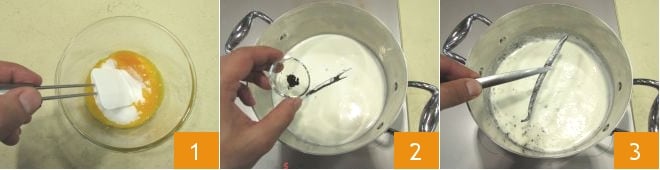 Pour préparer le bavarois au chocolat blanc et sauce à la menthe, hachez le chocolat blanc et mettez-le de côté. Ensuite, dans un bol, mélangez le sucre et les jaunes d'œufs en les amalgamant bien avec une spatule 1. Dans une casserole, versez le lait avec la crème. Incisez la gousse de vanille dans le sens de la longueur et récupérez les graines en les grattant avec un couteau. Mettez en infusion la gousse de vanille et ses graines 2 et placez sur le feu à feu doux. Lorsqu'il atteint l'ébullition, retirez la gousse de vanille 3.