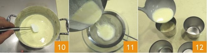Continuez à mélanger jusqu'à ce que le chocolat soit complètement fondu 10, puis filtrez la crème en la passant à travers un tamis fin 11, et enfin versez-la dans des moules de 5 cm de diamètre et 7 de hauteur 12. Transférez les moules au réfrigérateur pour raffermir pendant au moins une nuit, de préférence une journée entière.