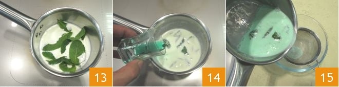 Passez à la préparation de la sauce à la menthe d'accompagnement. Chauffez la crème avec les feuilles de menthe 13. Une fois l'ébullition atteinte, retirez du feu et laissez infuser pendant une heure. Après ce temps, ajoutez le sirop de menthe et le colorant si vous souhaitez une couleur plus vive 14. Filtrez la sauce à travers un tamis pour éliminer les feuilles de menthe 15.