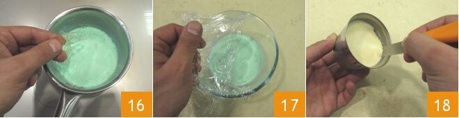Versez maintenant dans la sauce filtrée la gélatine en feuilles trempée comme ci-dessus 16, mélangez bien. Couvrez avec du film plastique 17 et laissez refroidir au réfrigérateur pendant environ une heure. Au moment de servir, commencez à démouler les bavarois : passez d'abord un couteau à lame lisse entre le bavarois et le moule 18.