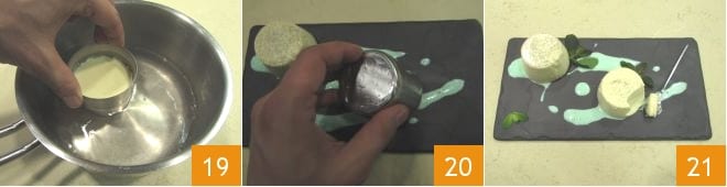 Pour faciliter l'extraction, plongez brièvement le moule avec le bavarois dans de l'eau chaude 19, en veillant à ne pas atteindre le bord pour ne pas mouiller l'intérieur. Retournez les moules sur l'assiette de service 20 et servez les bavarois de chocolat blanc accompagnés de la sauce à la menthe, en garnissant à votre convenance avec quelques feuilles de menthe fraîche 21.