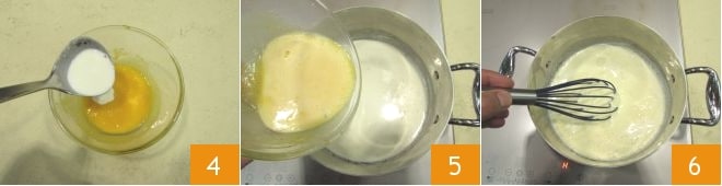 Délayez les jaunes sucrés avec un peu du mélange de lait chaud et de vanille 4, puis versez-les dans la casserole avec le reste du lait 5. Mélangez bien avec le fouet 6 et laissez épaissir jusqu'à ce qu'en plongeant une cuillère dans la crème, elle soit légèrement voilée. Une fois prête, retirez du feu.
