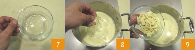 Mettez la gélatine en feuilles à tremper dans de l'eau froide pendant 10 minutes 7, essorez-la et ajoutez-la à la crème chaude 8 en continuant de mélanger. Ajoutez enfin le chocolat blanc haché 9.