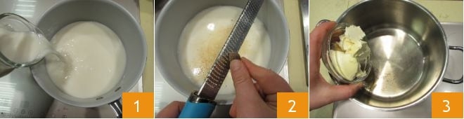 Pour préparer la béchamel vegan, commencez par verser le lait dans une casserole 1. Ajoutez la noix de muscade 2 et portez à frémissement. Pendant ce temps, transférez la margarine dans une autre casserole assez grande 3 et laissez-la fondre à feu doux.