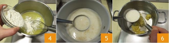 Lorsqu'elle est fondue, ajoutez la farine en pluie 4 et mélangez rapidement avec un fouet jusqu'à obtenir un roux couleur noisette. Dès que le lait est chaud, prélevez-en une louche 5 et versez-la dans le roux en continuant de mélanger constamment 6.