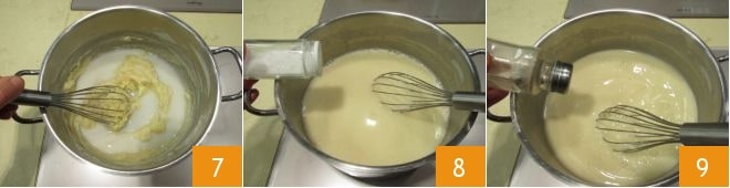 Ajoutez le lait chaud peu à peu 7 jusqu'à épuisement. Assaisonnez ensuite avec du sel 8 et du poivre 9.
