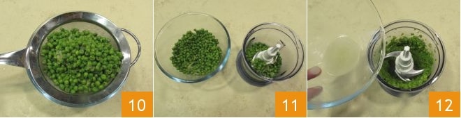 égouttez les petits pois dans une passoire en récupérant l'eau de cuisson dans un petit bol 10. Prenez la moitié des petits pois et mettez-les dans le mixeur 11 et mixez-les avec l'eau de cuisson 12