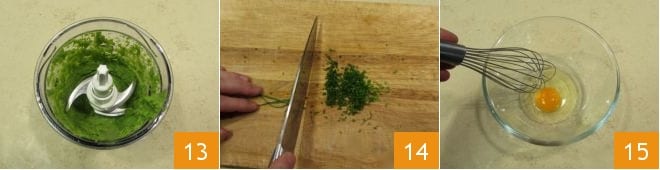 jusqu'à obtenir une crème dense et homogène 13. Réservez-la dans un bol et commencez à préparer la pâte : hachez la ciboulette 14. Dans un bol, commencez à travailler l'œuf avec un fouet 15