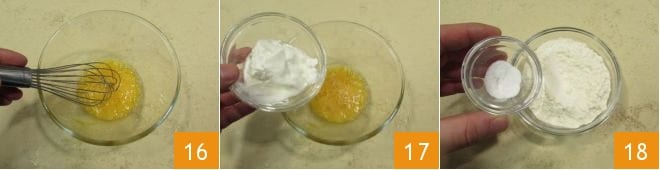 pour le battre 16, puis ajoutez le yaourt 17 et mélangez pour amalgamer le mélange ; dans un autre bol, versez la farine avec le bicarbonate 18