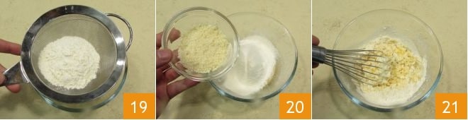 puis ajoutez-les au mélange d'œufs en vous assurant de les tamiser à travers une passoire 19. Assaisonnez avec le fromage râpé 20 et mélangez bien les ingrédients avec un fouet 21.