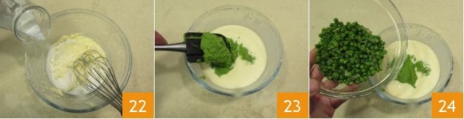 versez le lait et continuez à mélanger 22 pour obtenir un mélange homogène et sans grumeaux, ajoutez également le mixé de petits pois 23. Si nécessaire, rectifiez l'assaisonnement en sel et poivre, mélangez et ajoutez également les petits pois entiers 24