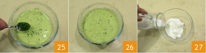 et aromatisez avec la moitié de la ciboulette hachée 25. Réservez le mélange 26 et préparez la sauce au yaourt : dans un bol, versez le yaourt grec et ajoutez le lait 27.