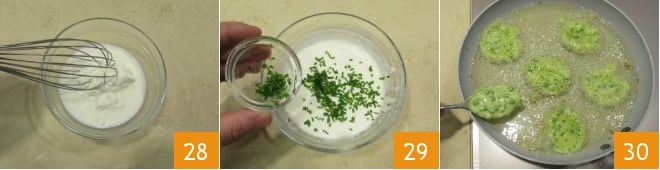 Mélangez les ingrédients avec un fouet 28 et terminez en aromatisant avec le reste de la ciboulette hachée 29. Dans une poêle, chauffez l'huile de graines pour la friture (vous ne devez pas frire dans une huile profonde, les beignets doivent flotter mais ne pas être complètement immergés) et versez une cuillère de pâte pour former les beignets 30. Pour une friture optimale, l'huile doit avoir une température de 180°, pour mieux contrôler la cuisson, il est conseillé d'utiliser un thermomètre alimentaire.