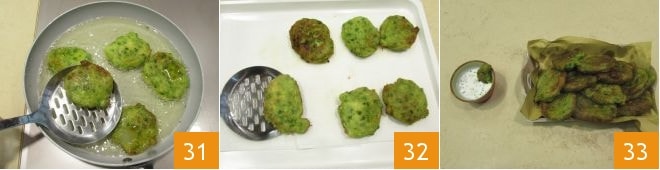 Retournez les beignets après quelques minutes pour les faire dorer de l'autre côté 31, puis égouttez-les à l'aide d'une écumoire sur un plateau recouvert de papier absorbant pour les égoutter et tamponner l'excès d'huile 32. Servez vos beignets de petits pois, de préférence bien chauds, accompagnés de sauce au yaourt 33 !