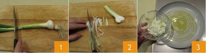 Pour préparer les beignets de petits pois avec sauce au yaourt, commencez par nettoyer l'oignon de printemps : éliminez la partie verte de la tige 1, la racine et la couche extérieure la plus dure. Puis, coupez-le en fines tranches 2. Dans une poêle, chauffez un filet d'huile et ajoutez l'oignon de printemps 3,